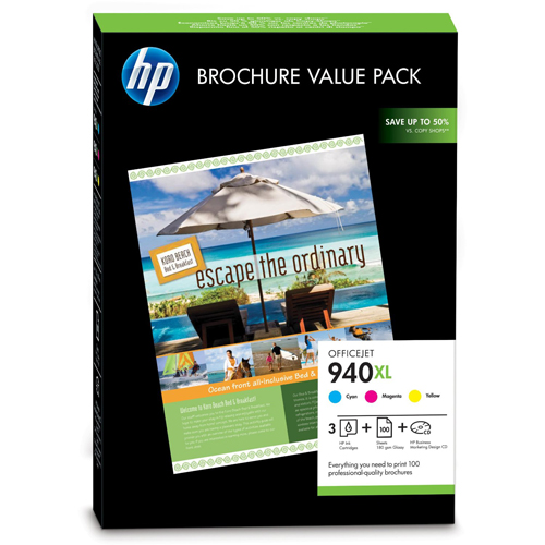 HP940XL Marketing Pack contains 3 Colour HP 940 High Capacity Ink Cartridges, Paper & Design CD